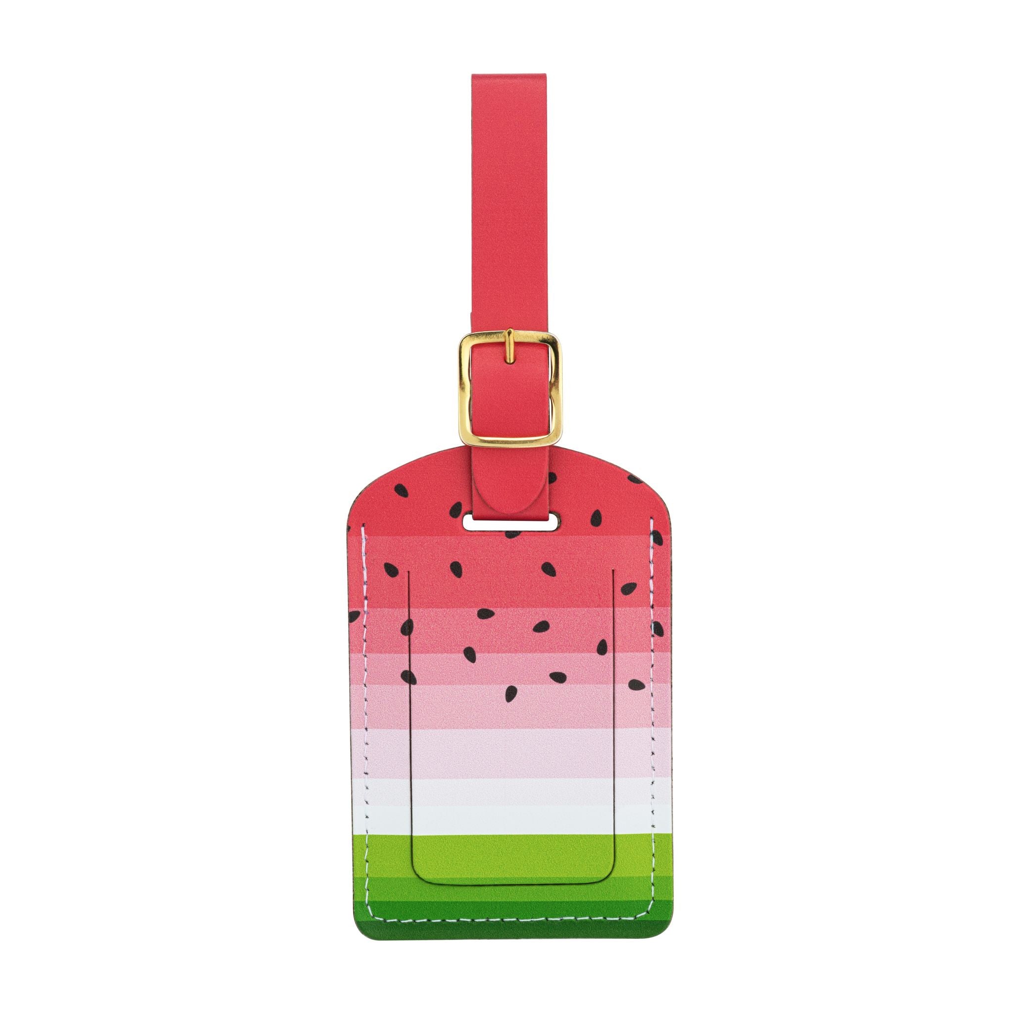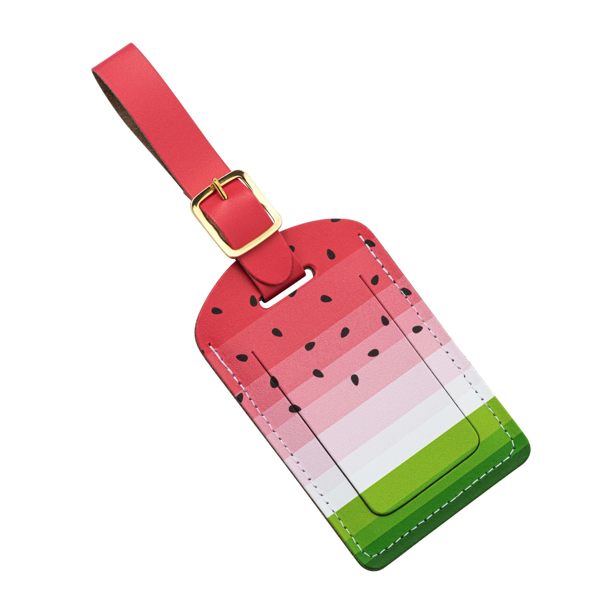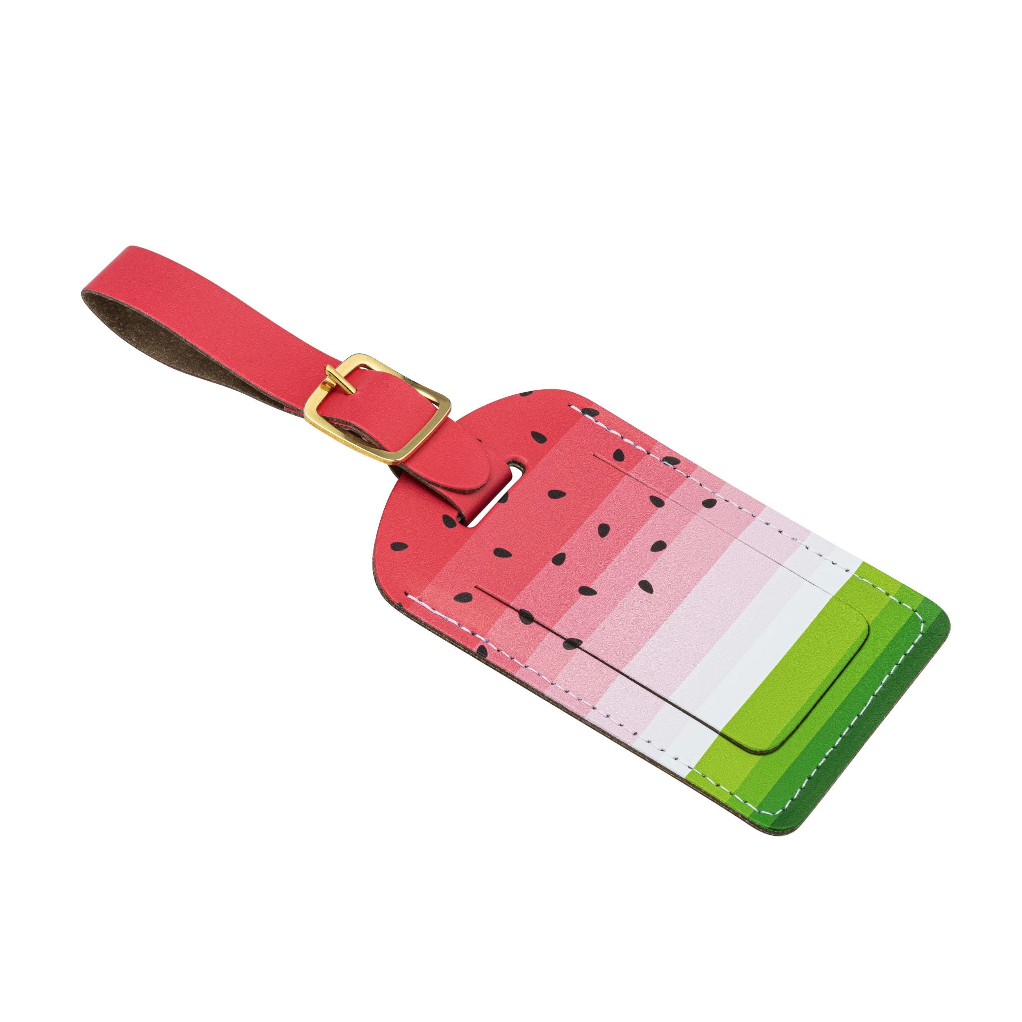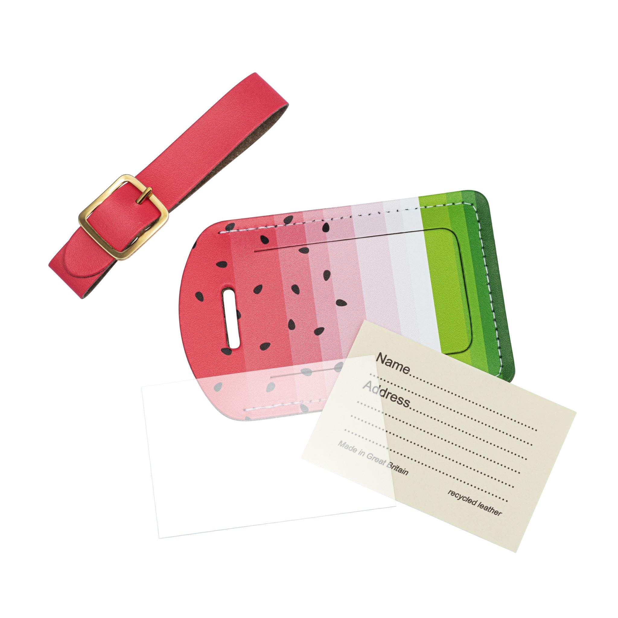 Recycled Leather Luggage Tag, featuring a watermelon print, handmade in the UK.