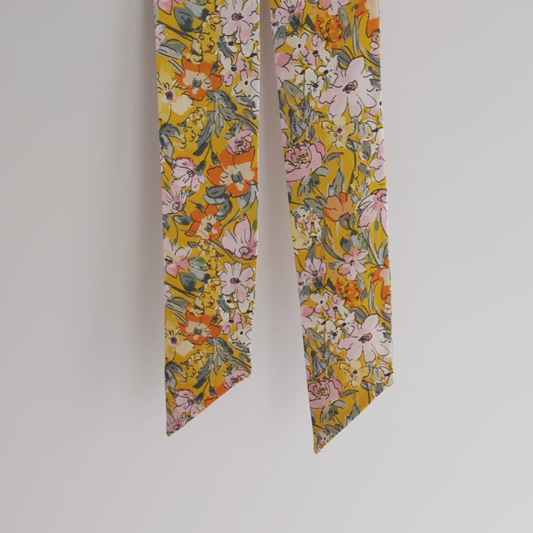 This mustard yellow floral short silk scarf is incredibly versatile, making it a must-have accessory in any wardrobe. Wear it tied elegantly around your neck, wrap it around the handle of your favourite bag, style it in your hair as a headband or around a ponytail or messy hair bun, or drape it around a wide-brimmed sun hat, the possibilities are endless.